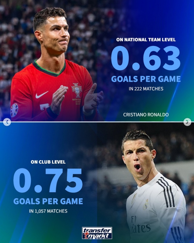C罗(40岁):俱乐部1057场,场均0.75球;国家队222场,场均0.63球