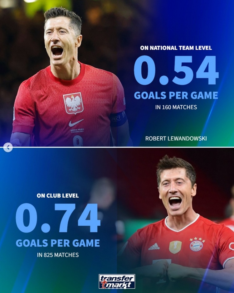 莱万(37岁):俱乐部825场,场均0.74球;国家队160场,场均0.54球