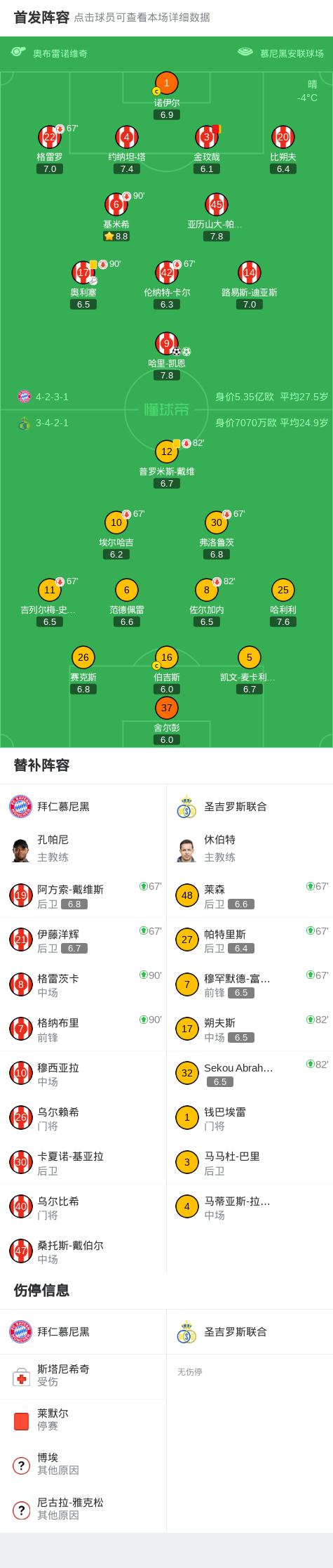 第55分钟,凯恩造点,随后主罚命中完成双响,拜仁2-0圣吉罗斯联合